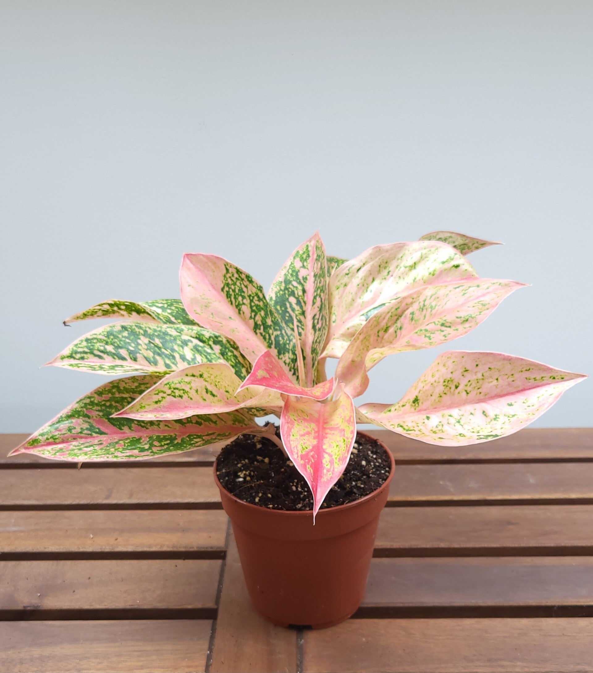 De Aglaonema 'Prestige' heeft bijzonder mooie opvallende roze/ groene bladeren en roze bladstelen.