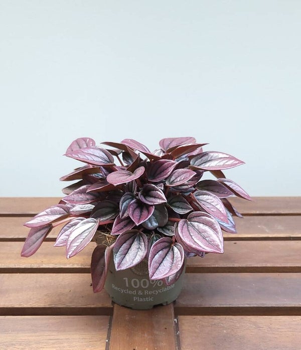 De Peperomia Caperata Cayenne is een vrij nieuwe soort. De glanzende bladeren hebben een sprekende paarse kleur met donkere nerven.