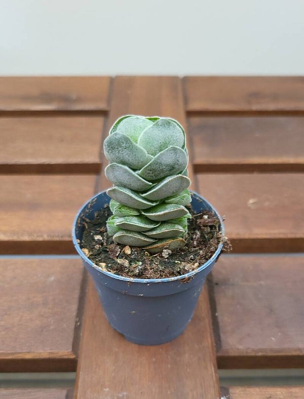 De crassula pagoda is een vetplant met grijs/groene bladeren die op elkaar gestapeld zijn. De bladeren hebben de vorm van een golvende driehoek.