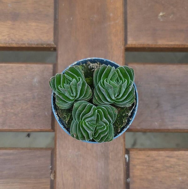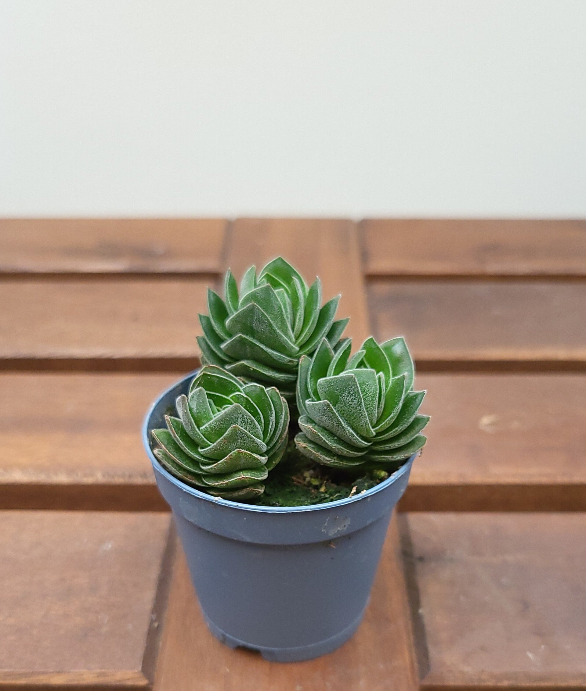 De Crassula 'Buddha's Temple' is een bijna perfect symmetrische plant. De bladeren zijn dicht op elkaar gestapeld met 'omgevouwen' randen.