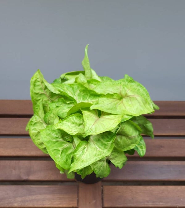 Fris groene kamerplant met pijlvomige bladeren en roze nerf.