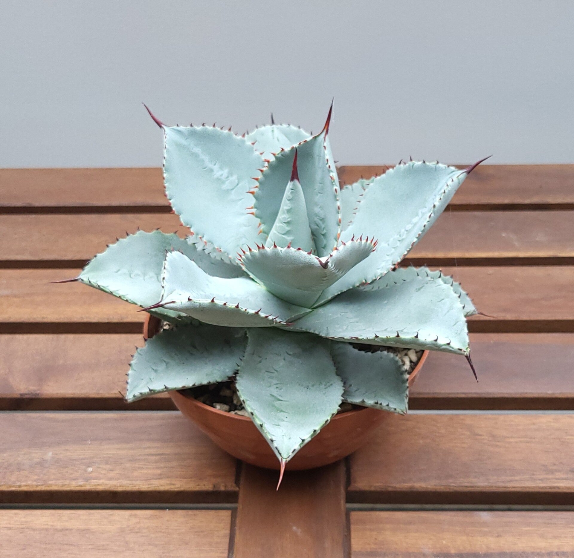 Deze Agave heeft een prachtige blauwe kleur. Op het blad is ook een mooie 'tekening' zichtbaar.