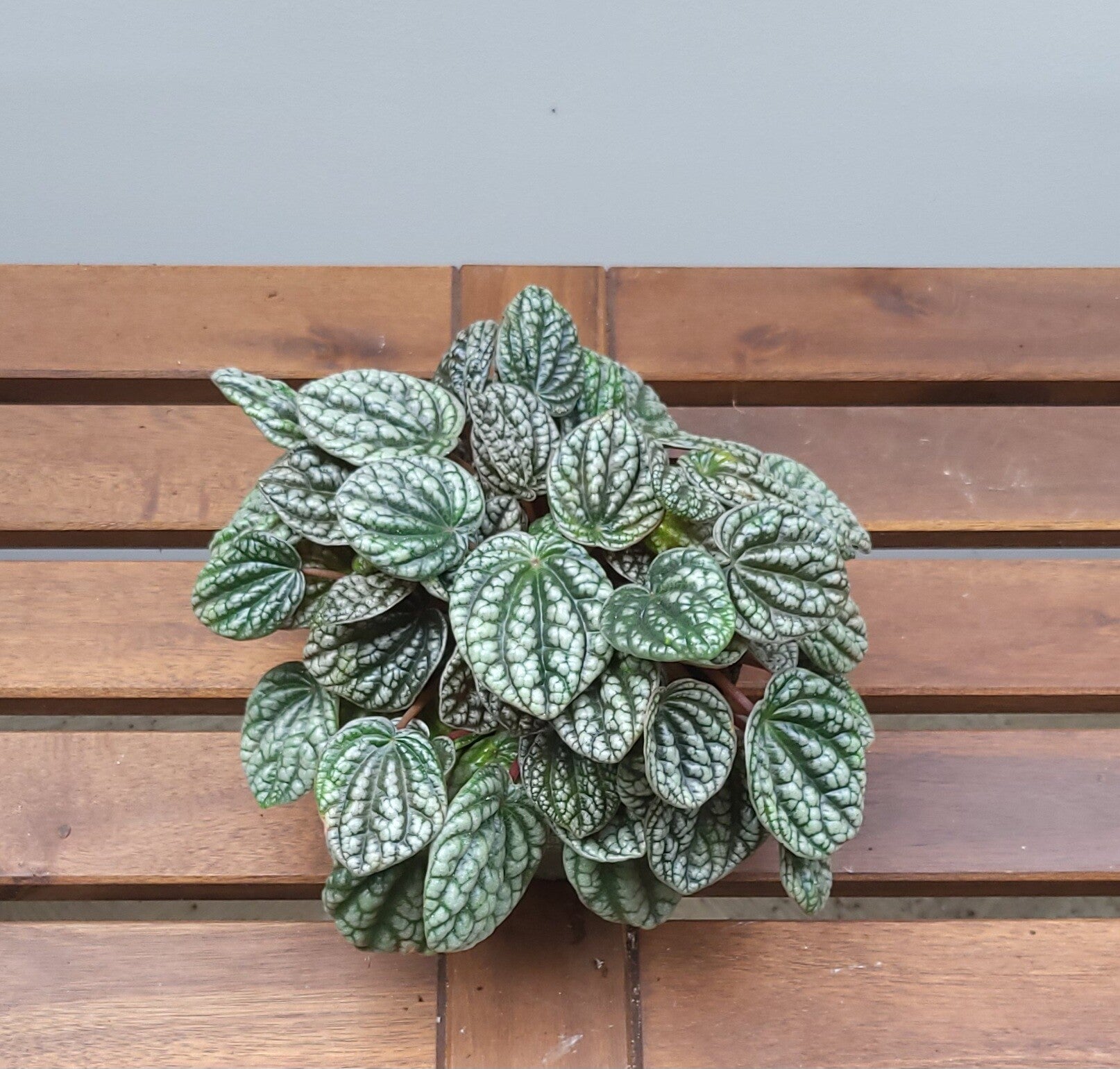 De Peperomia Burbella heeft kleine bladeren met een lichte grijs/groene kleur en duidelijke donkere nerven.