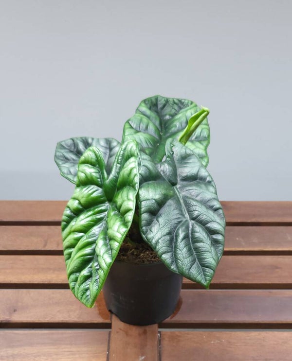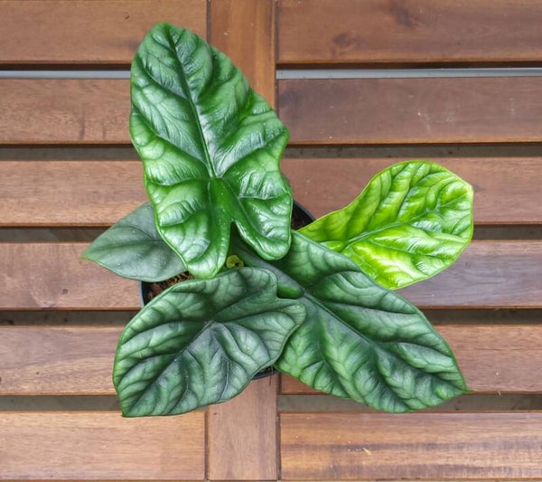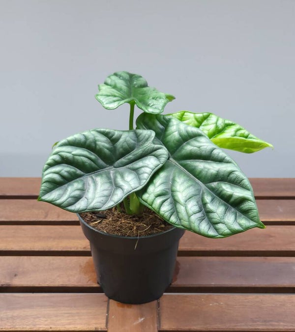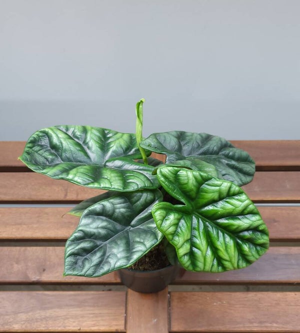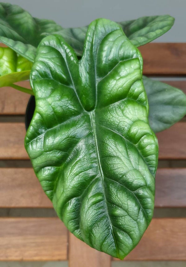 De Alocasia baginda 'Green Dragon' heeft donkergroene bladeren die zijn voorzien van duidelijke nerven, ze zorgen voor een mooi effect.