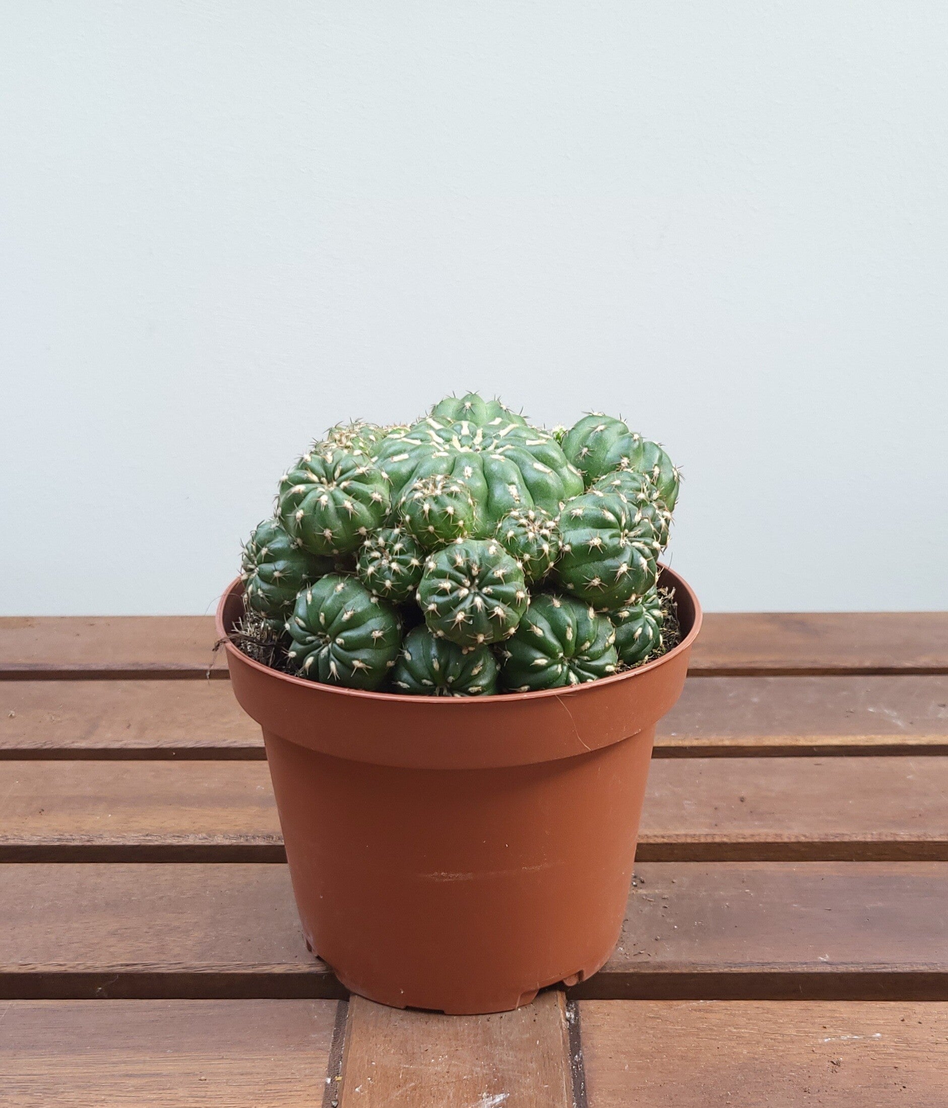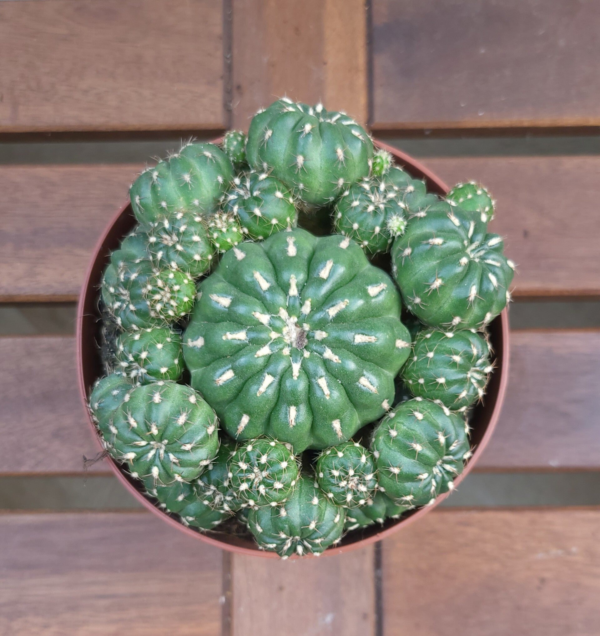 Deze kleine cactus heeft een trosvorm en is een klein blijvende cactus. De stekels zijn witachtig met donkere punten.