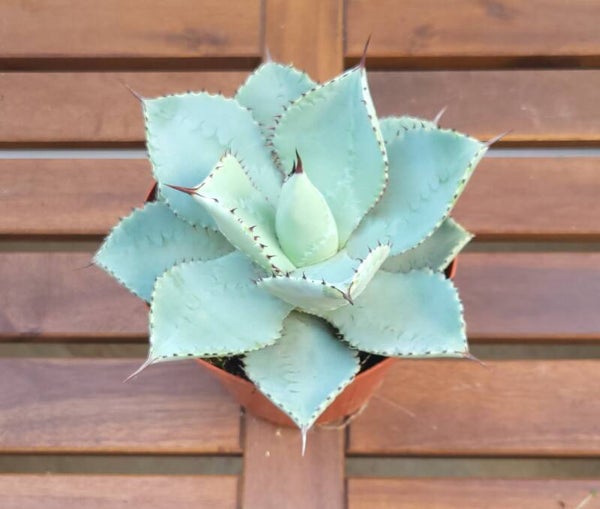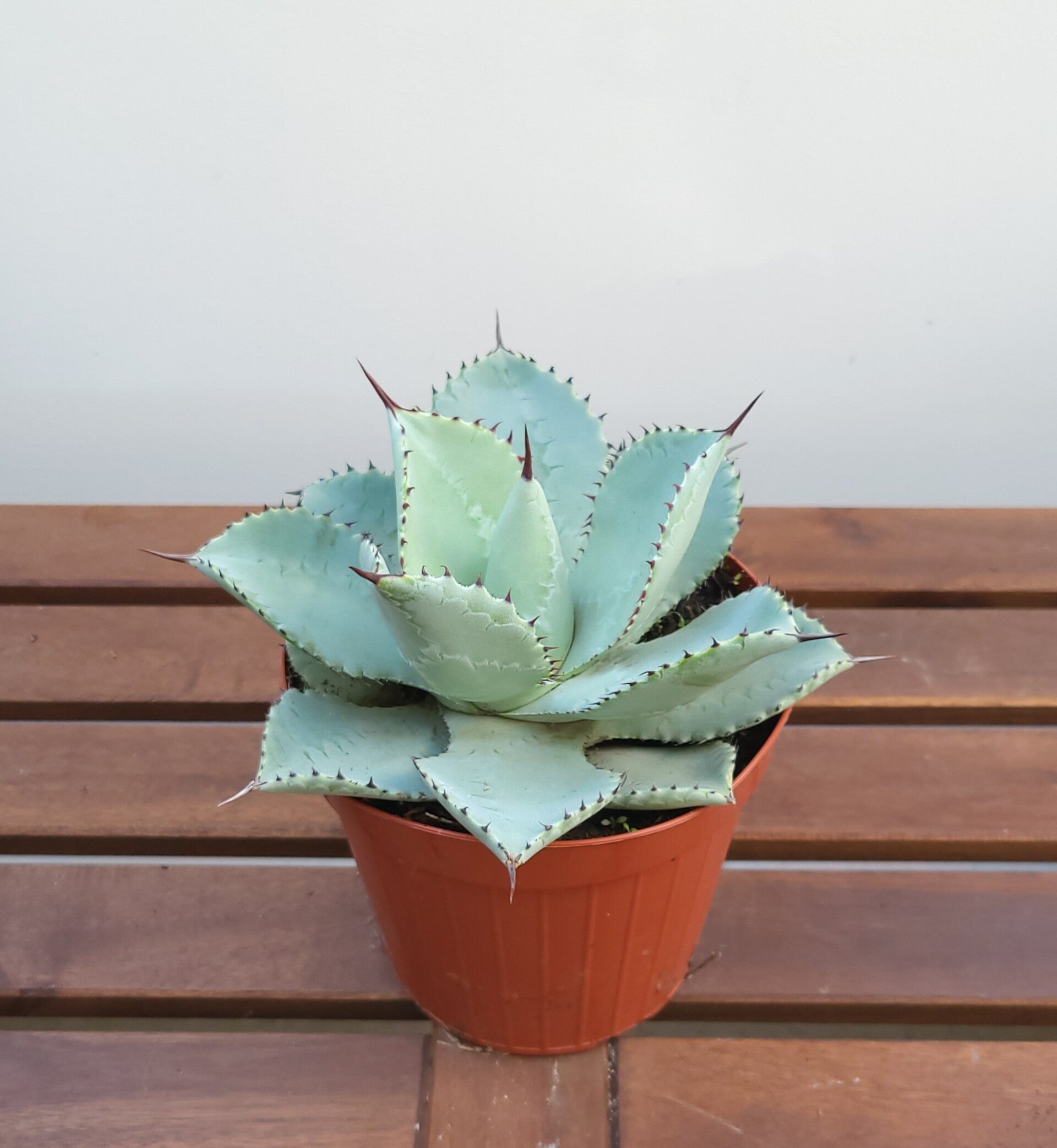 Deze Agave heeft een prachtige blauwe kleur. Op het blad is ook een mooie 'tekening' zichtbaar.