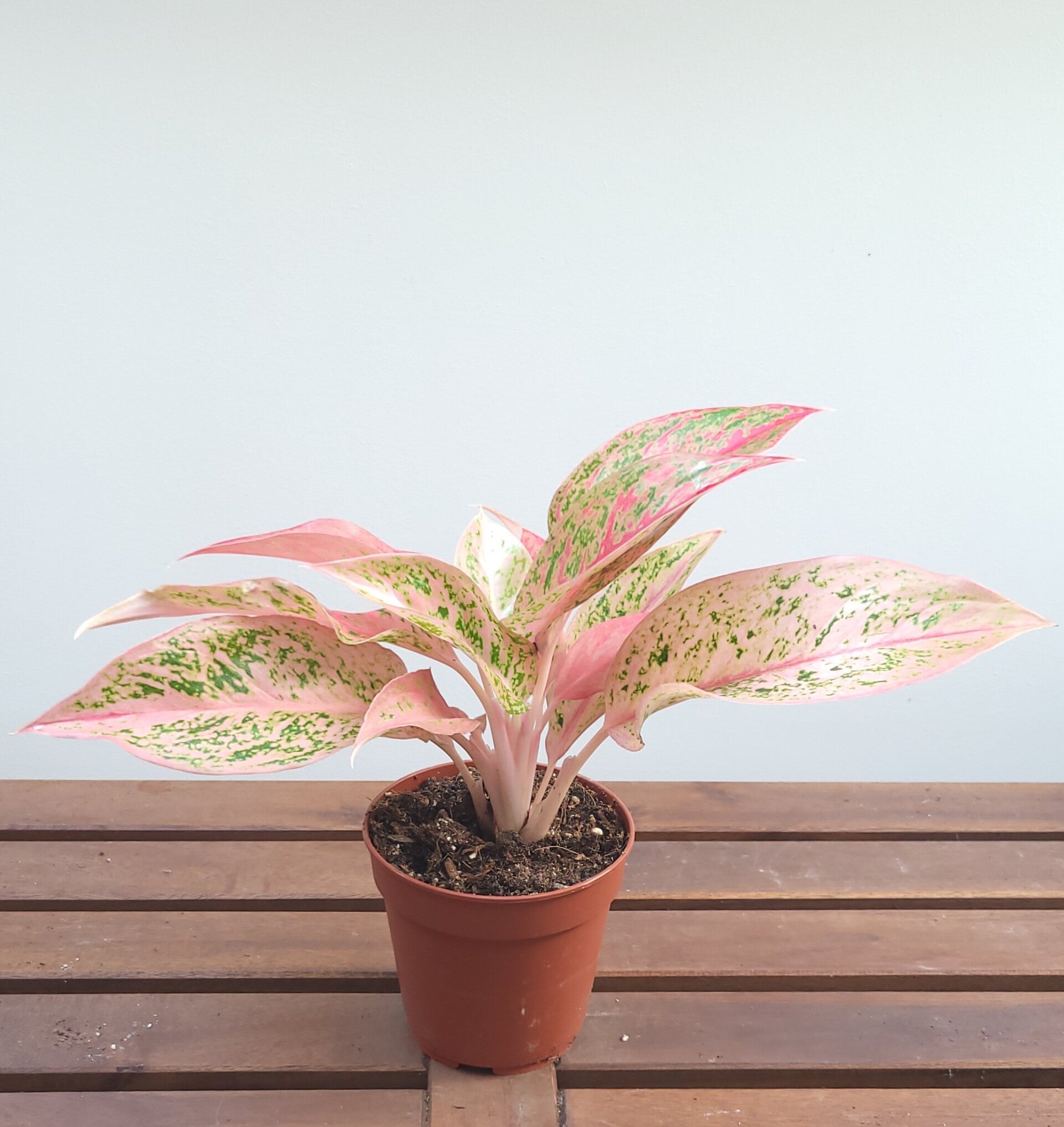De Aglaonema 'Prestige' heeft bijzonder mooie opvallende roze/ groene bladeren en roze bladstelen.
