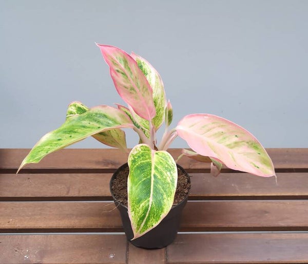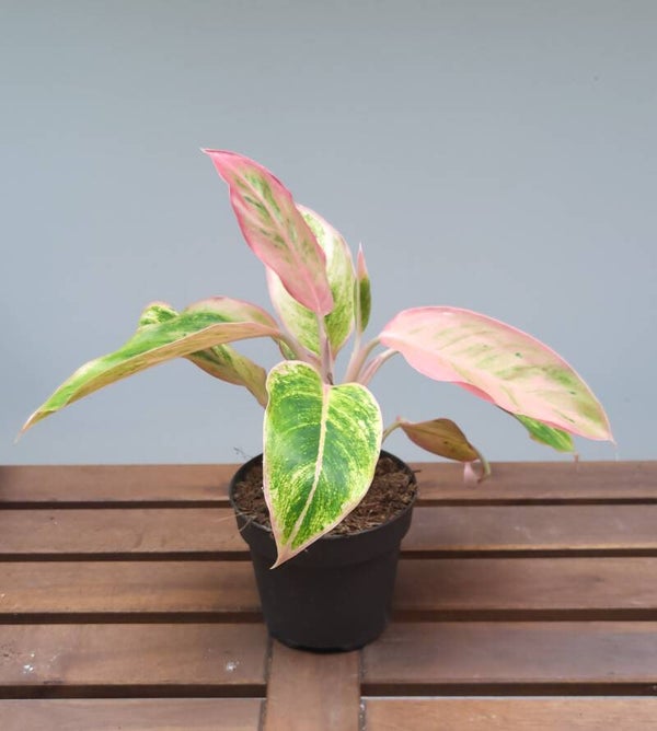 Deze plant heeft opvallende groen met lichtroze bladeren en lichroze bladstelen.