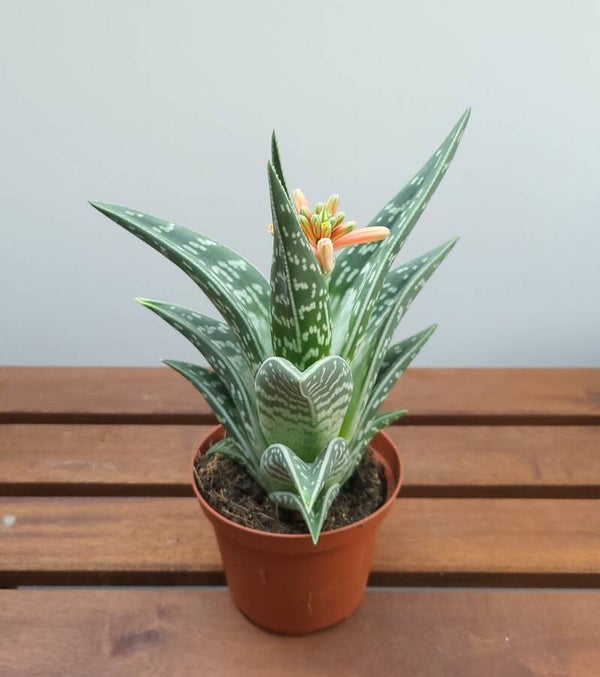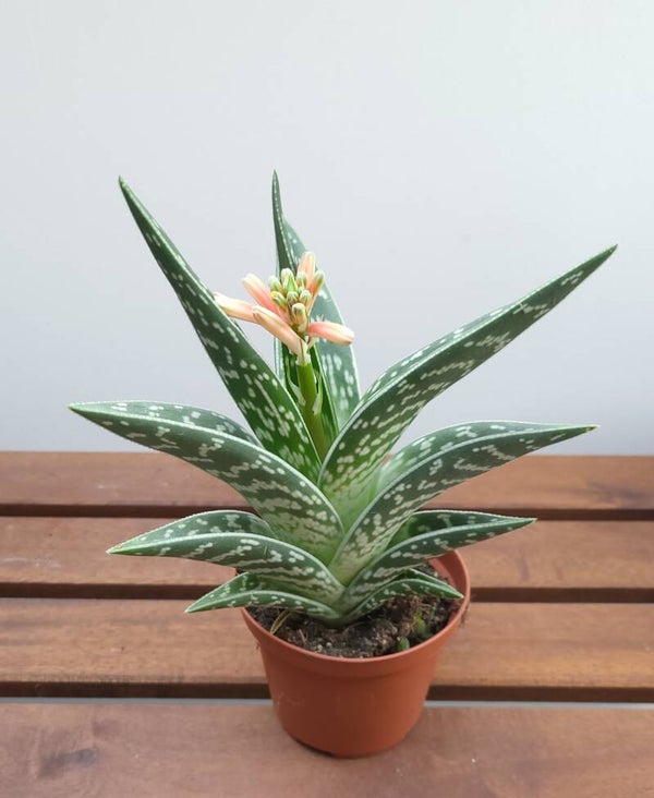 Deze Tiger Aloë staat nu in bloei. Bij bestelling ontvang je ook daadwerkelijk deze bloeiende plant1