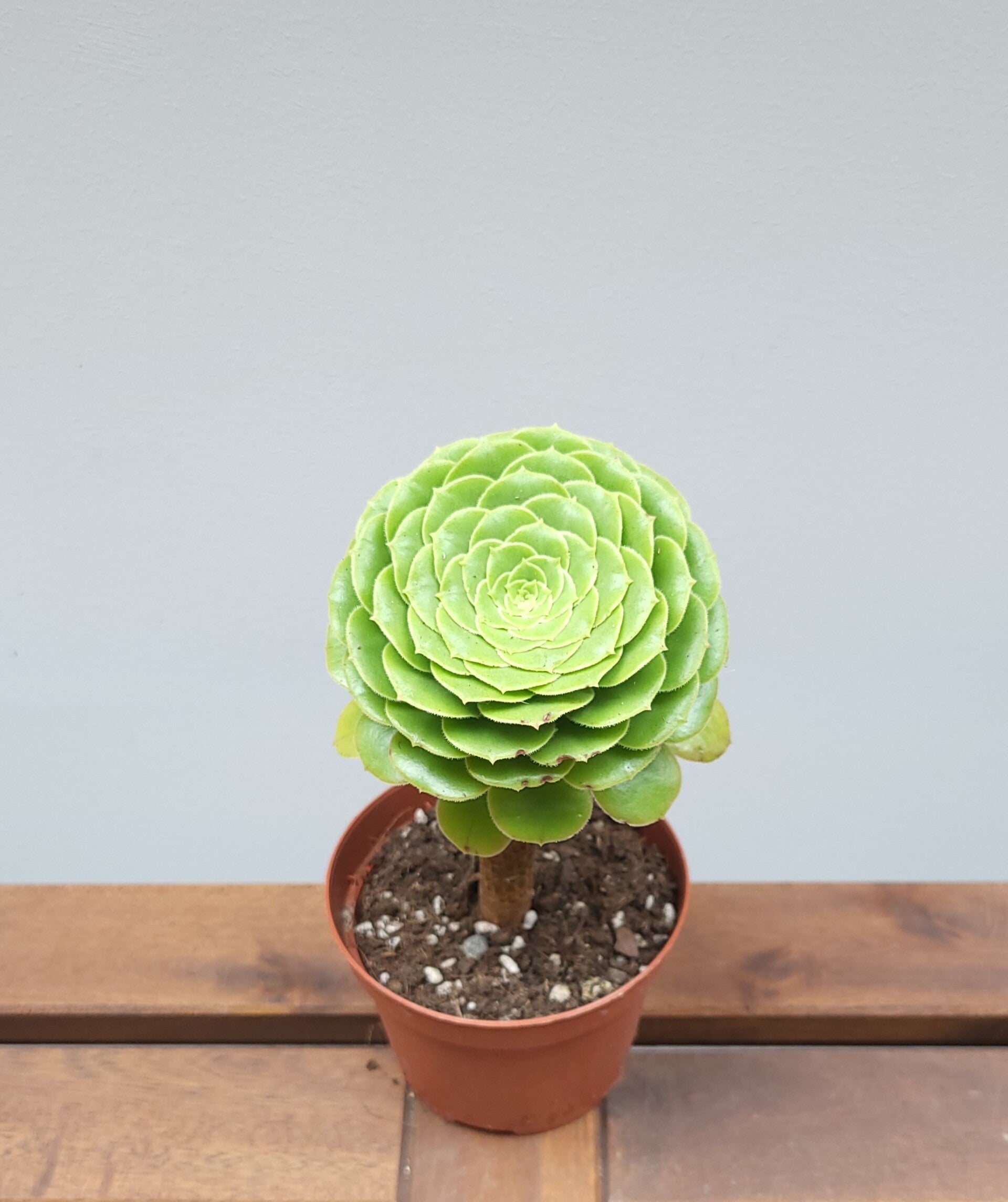 Deze Aeonium vormt prachtige rozetten op de stam waarbij de bladeren dicht op elkaar zitten.