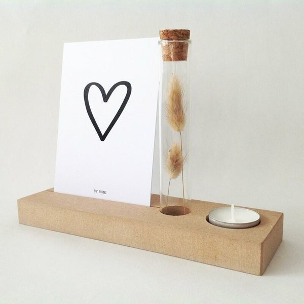 Mooie houder van hout waarin de meegeleverde kaart, of een eigen kaart of foto, getoond kan worden. Het vaasje met droogbloemen en het vakje met meegeleverd waxinelichtje maken het helemaal af.