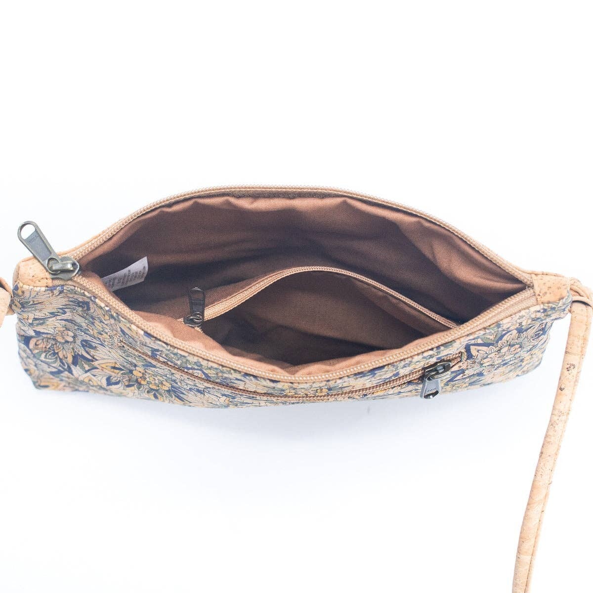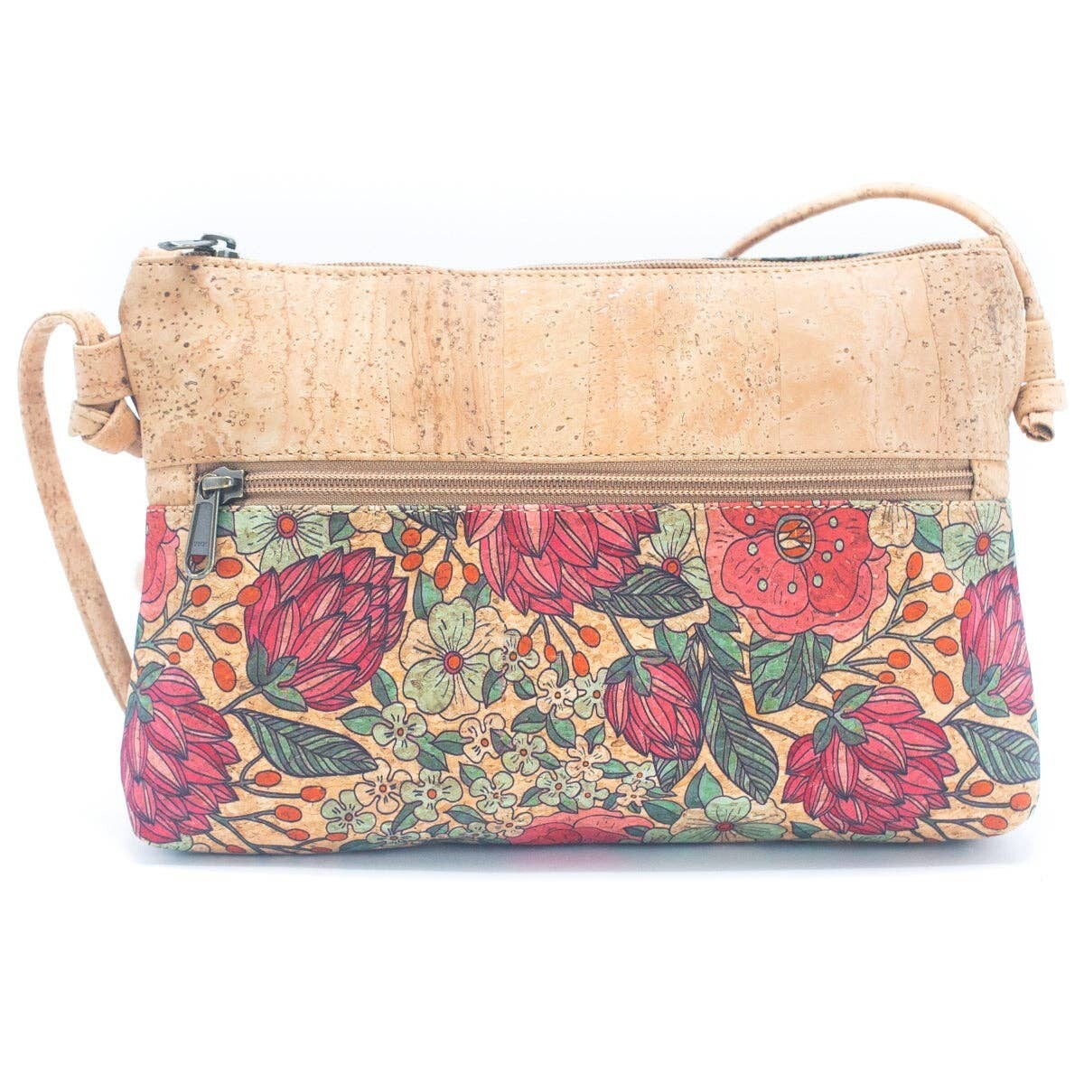 Kurken crossbody tas met een levendig en kleurrijk bedrukt ontwerp, ontworpen voor vrouwen die duurzaamheid en stijl waarderen.