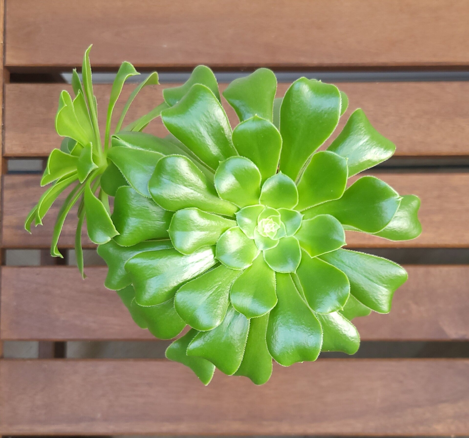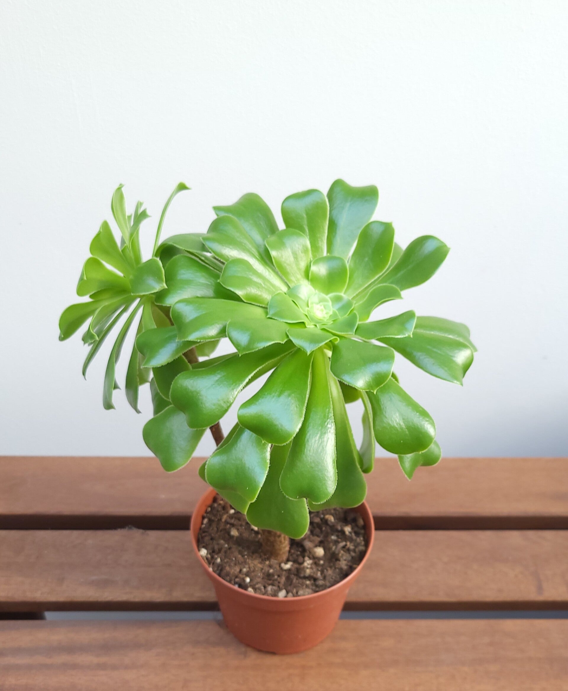Deze Aeonium vormt prachtige rozetten op de stam waarbij de bladeren dicht op elkaar zitten.