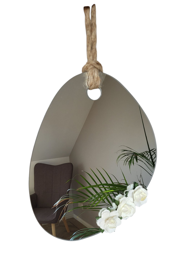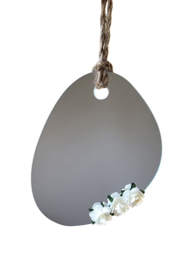 Organische vorm spiegel met bloemen van papier.De spiegel heeft een ophanglus van touw.