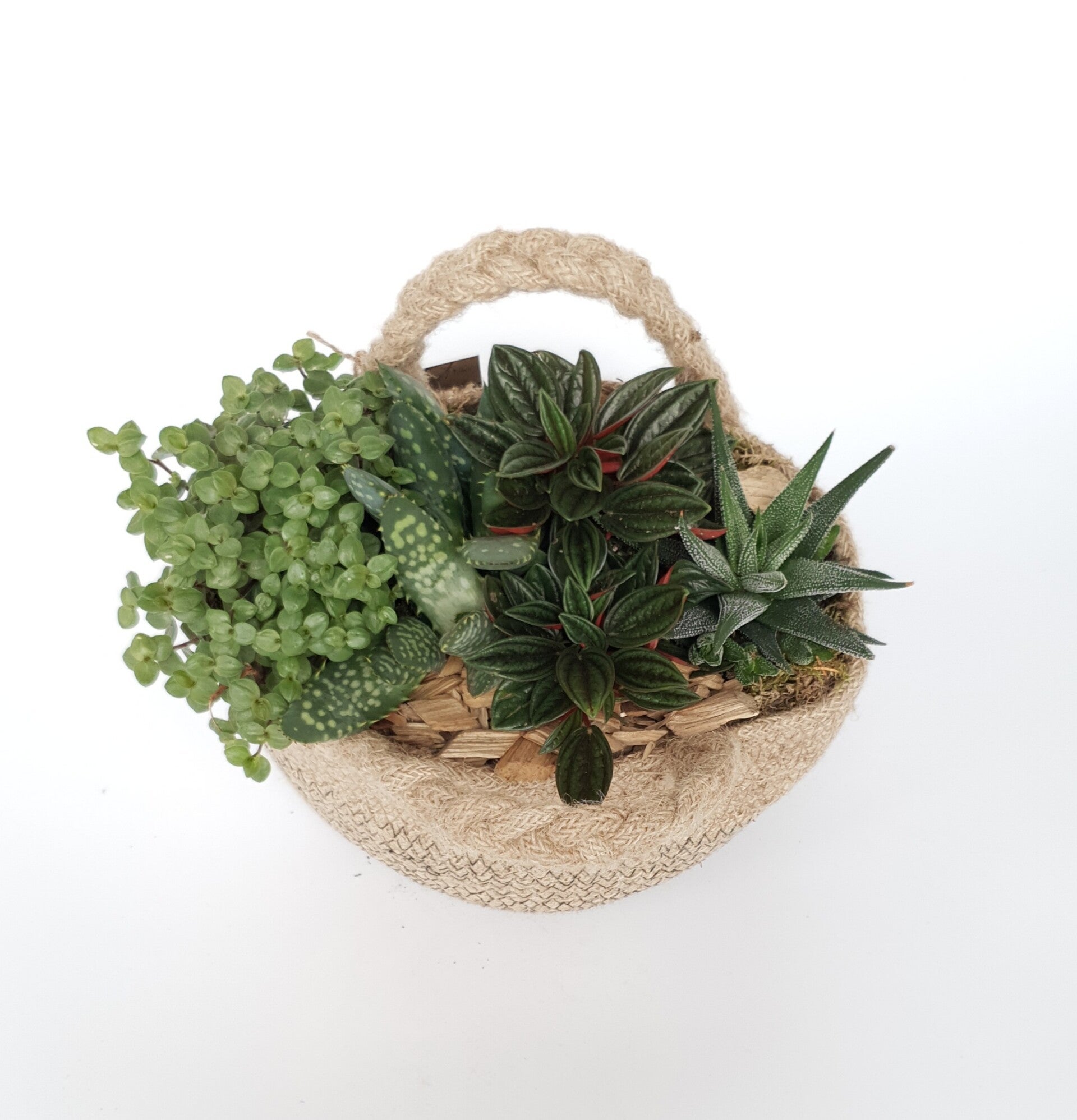 Deze jute tas met hengsels is gevuld met diverse plantjes.
