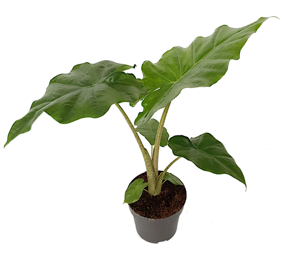 De Alocasia staat bekend om zijn bijzondere bladstelen en aparte bladeren.