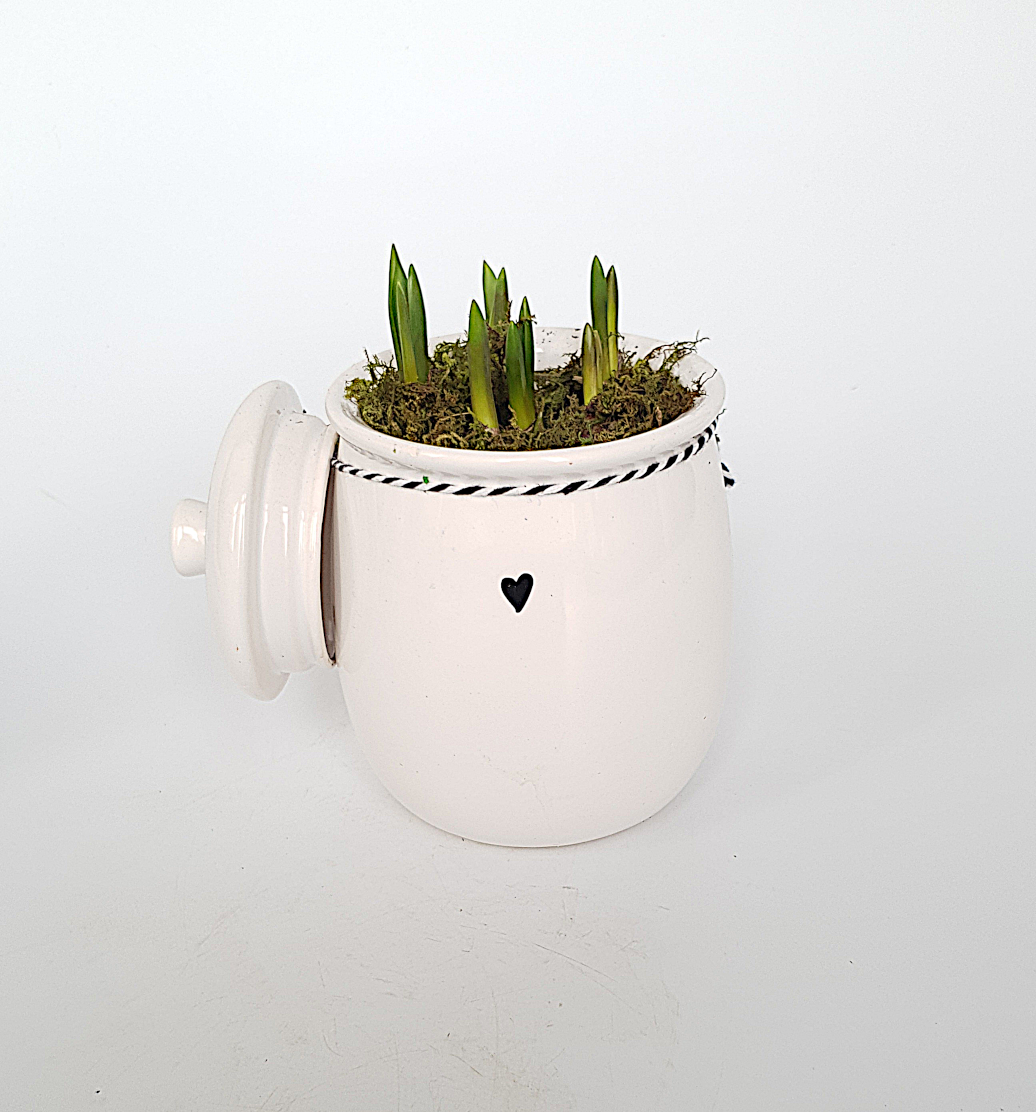 De voorraadpot is bedrukt met een hartje en gevuld met narcissen.