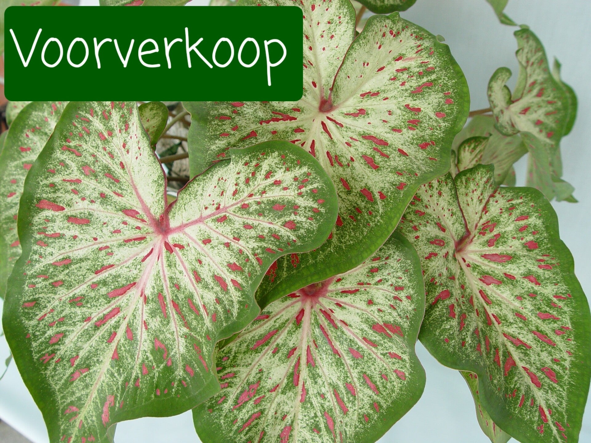 De Caladium is een bijzondere plant die niet vaak te verkrijgen is. De diversiteit aan patronen en kleuren is prachtig.