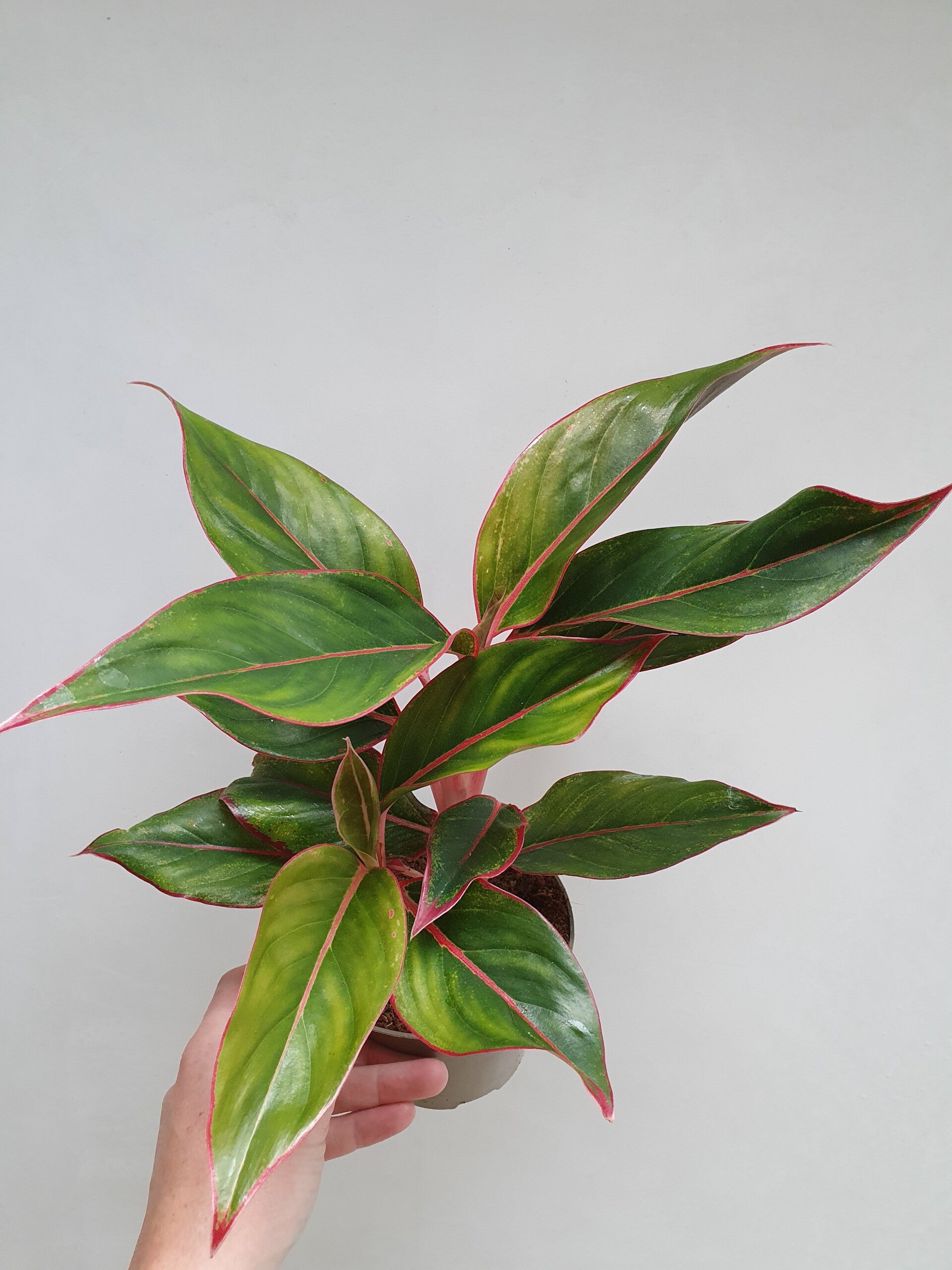 Mooi donkergroen blad met roze bladrand en roze bladstelen.