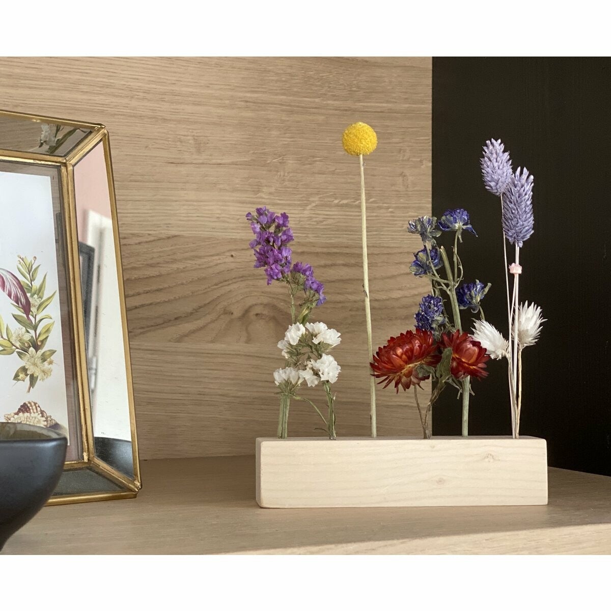 Mooie gedroogde bloemen in een houten standaard. Een geweldig cadeau!