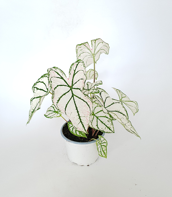 De Caladium is een bijzondere plant die uitsluitend in het voorjaar wordt aangeboden. De diversiteit aan patronen en kleuren is prachtig.