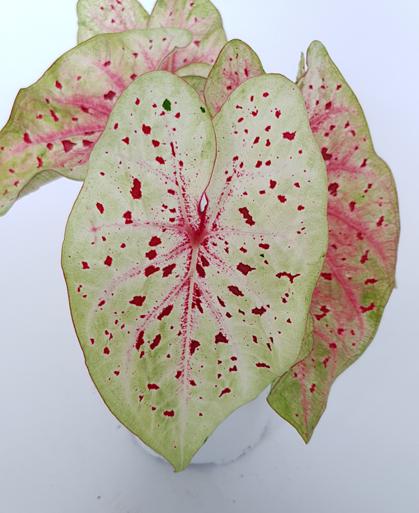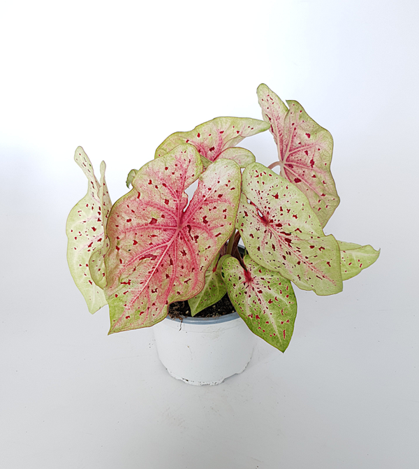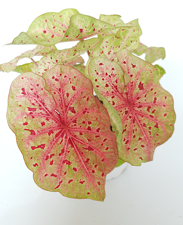 De Caladium is een bijzondere plant die uitsluitend in het voorjaar wordt aangeboden. De diversiteit aan patronen en kleuren is prachtig.