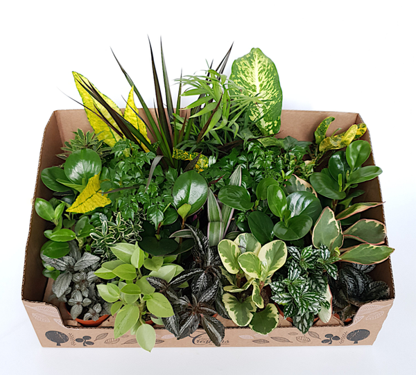Complete doos met een mix aan kamerplanten.De doos bevat 24 planten.