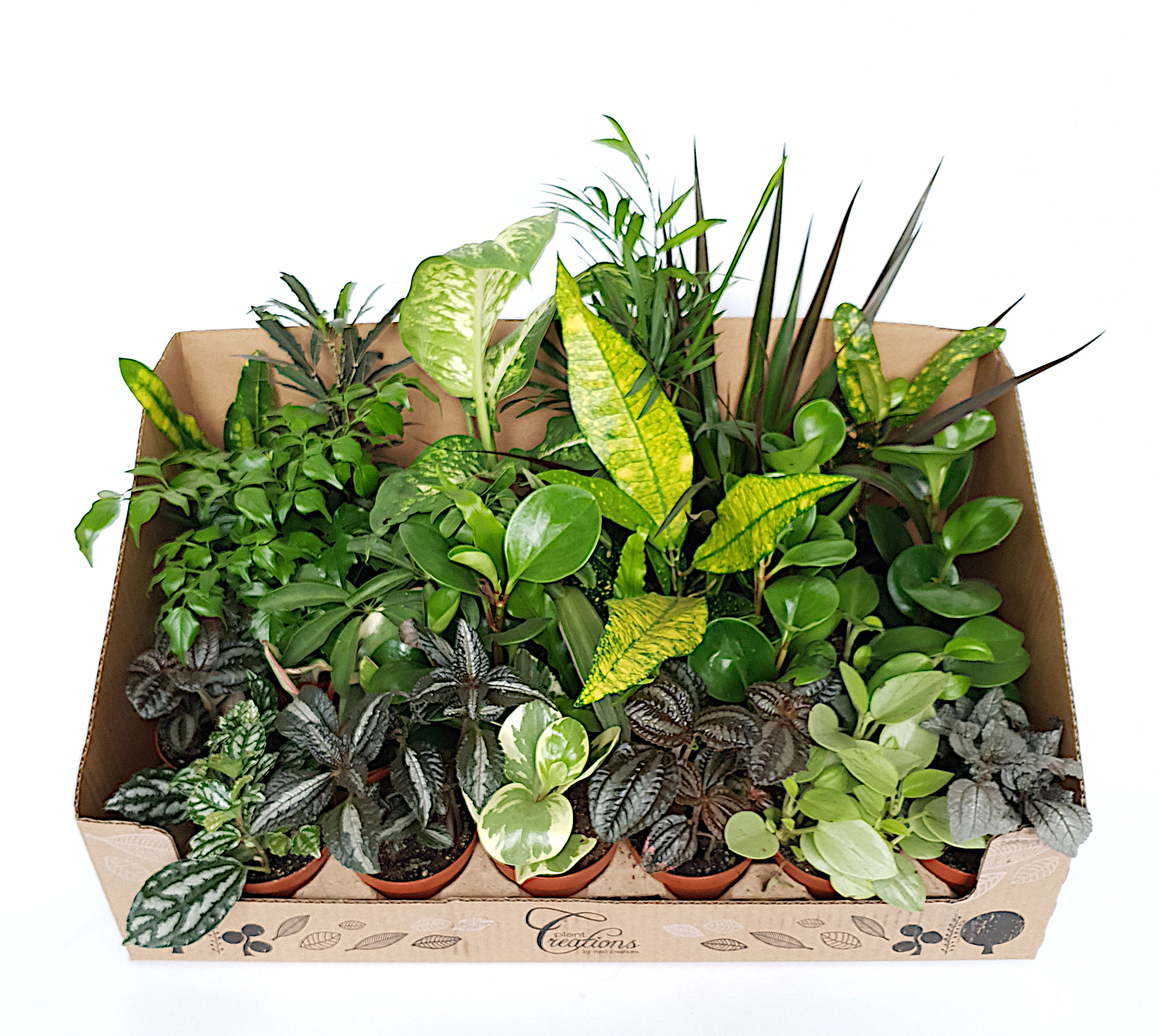 Complete doos met een mix aan kamerplanten.De doos bevat 24 planten.