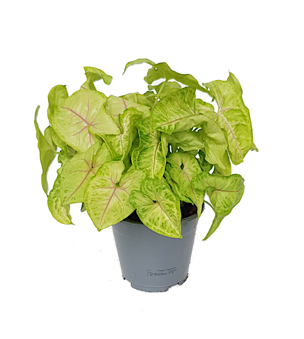 Fris groene kamerplant met pijlvomige bladeren en roze nerf.