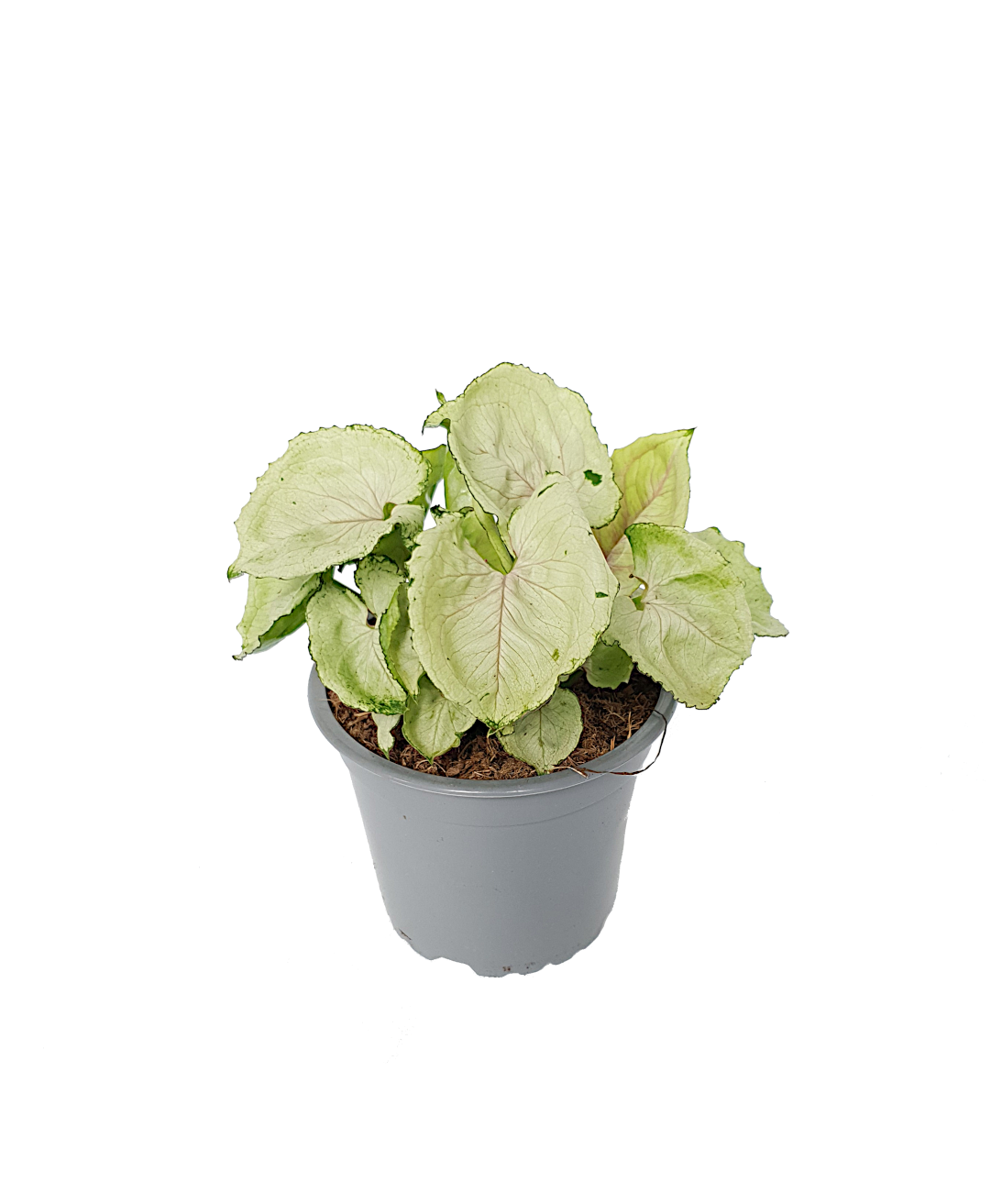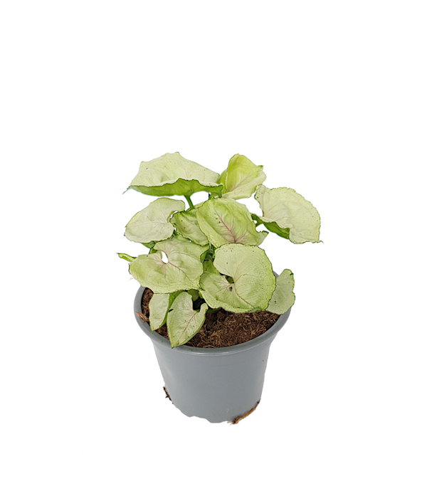 De Syngonium tropicana is een bijzondere verschijning door zijn licht groene blad met roze nerven.