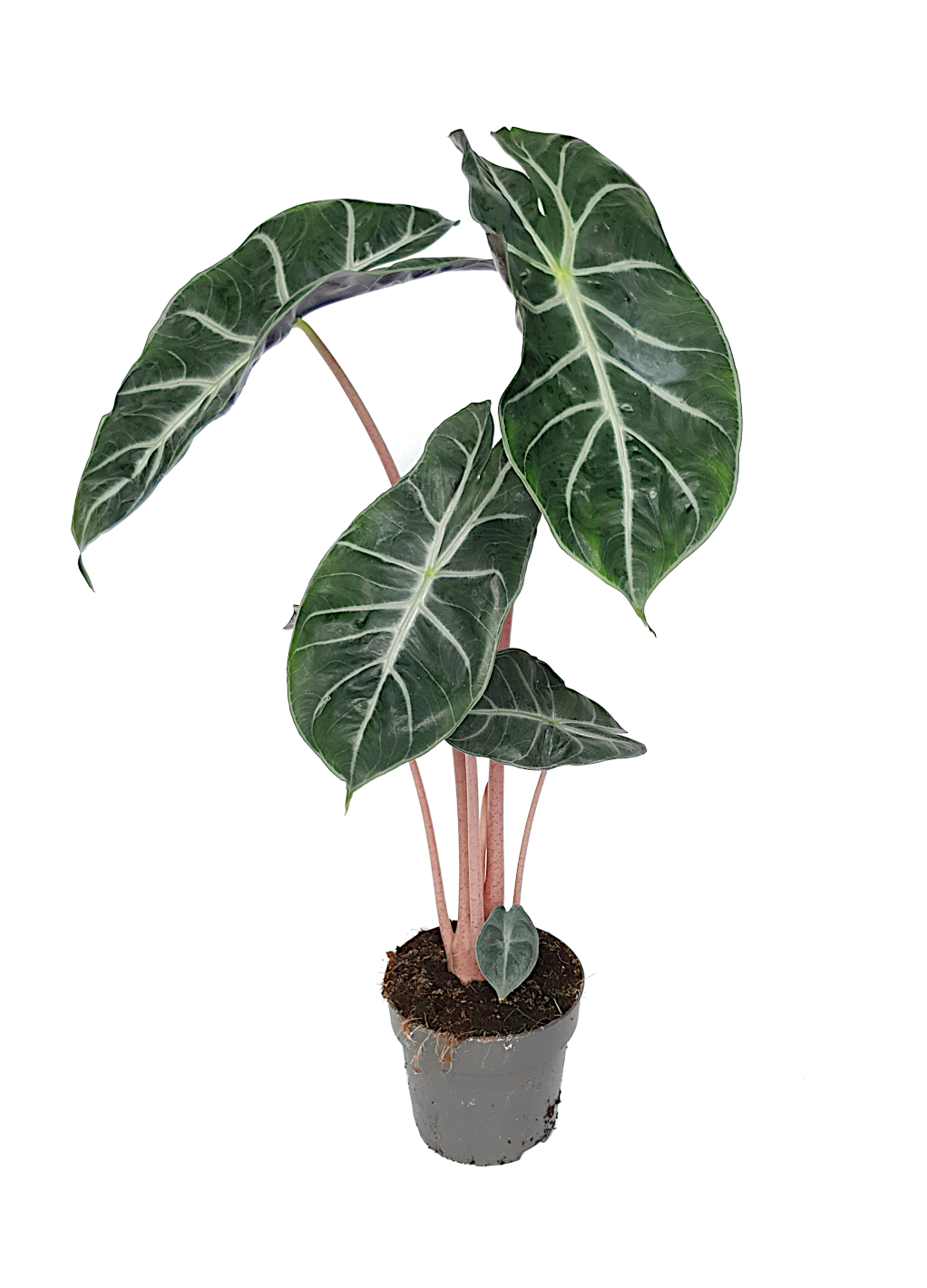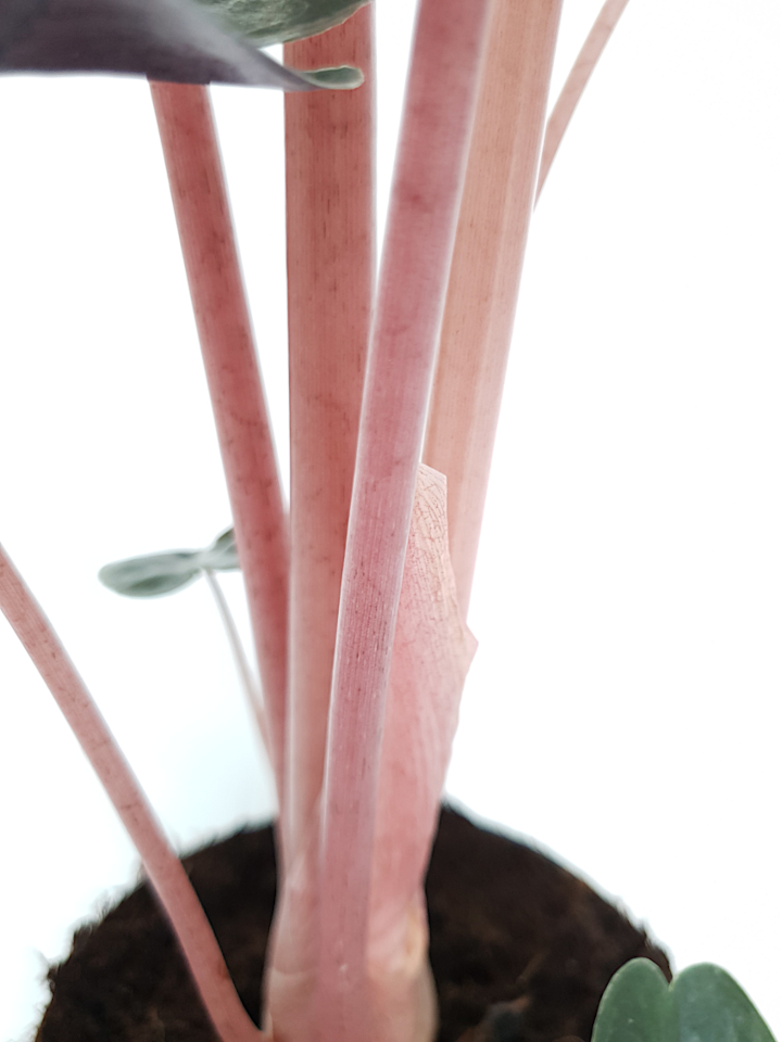 Deze plant staat bekend om zijn aparte blad en heeft opvallende roze bladstelen.