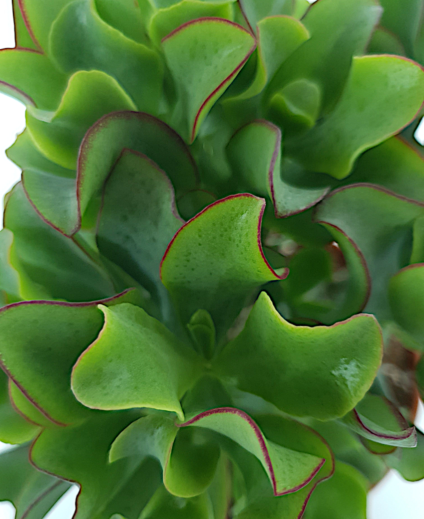 Deze succulent heeft licht golvende bladeren met een bruin/ rood randje.