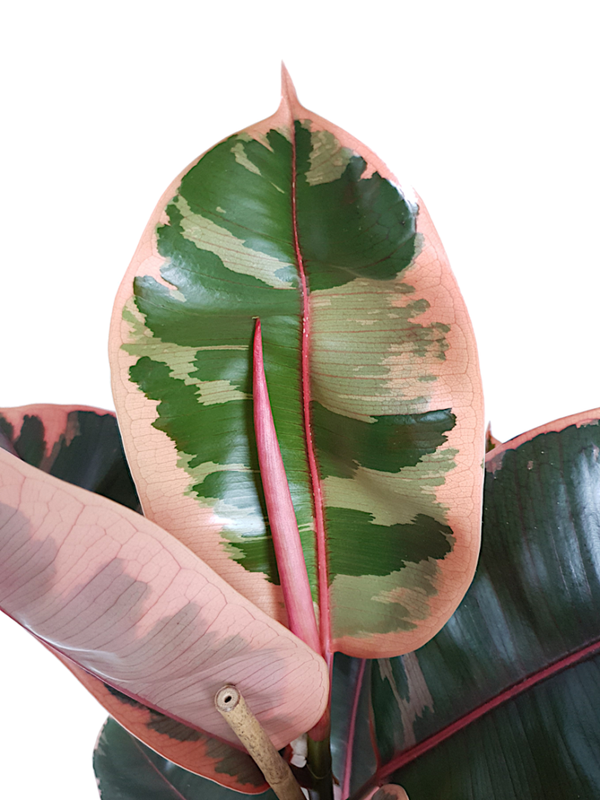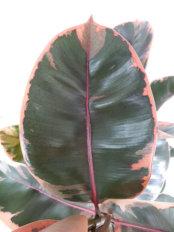 In deze pot zitten drie stammen waardoor een mooie volle plant is gecreëerd. De bladeren zijn stevig en bont met kleuren in roze en donkergroen.