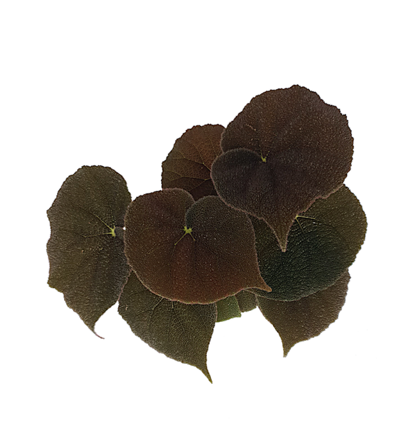 De Begonia masoniana 'River' is een bijzondere plant met aparte structuur. Zijn grote bladeren zijn donkergroen/bruin van kleur met een paarse/rode onderkant wat een heel mooi effect geeft.