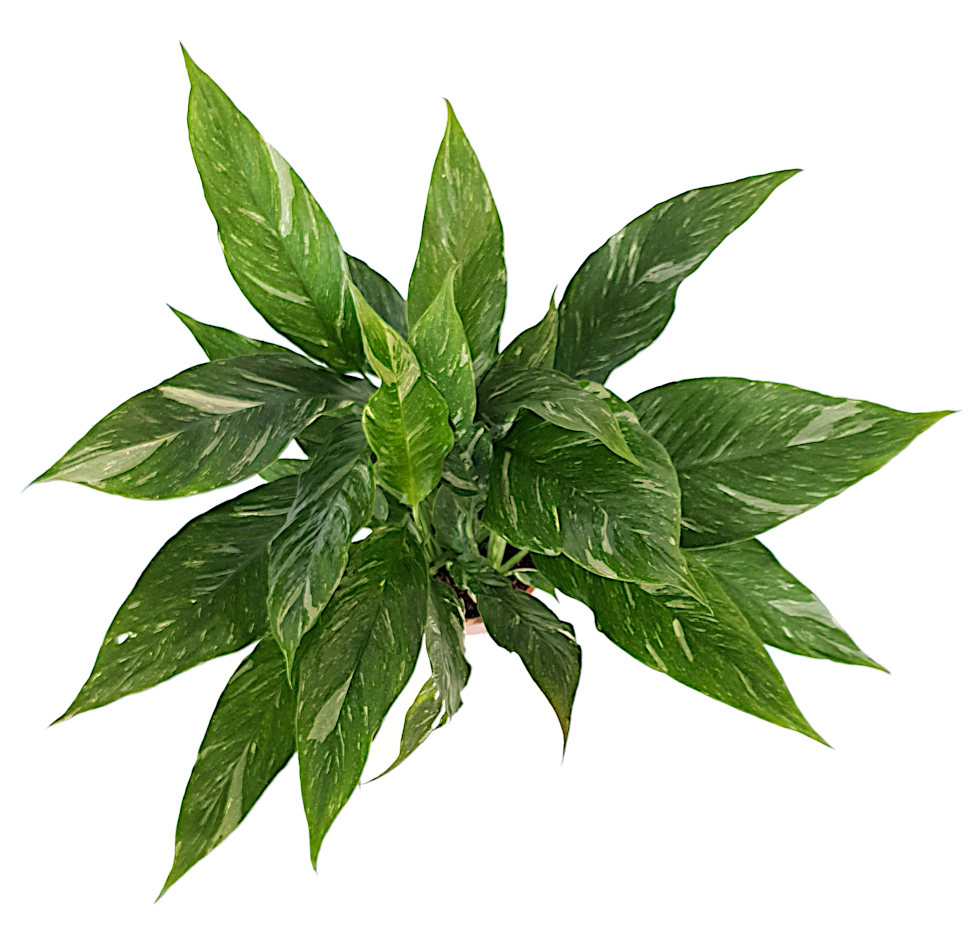 De Spathiphyllum is een gemakkelijke kamerplant met lancetvormig blad. De 'Diamond' variant heeft bladeren met wit variegata.