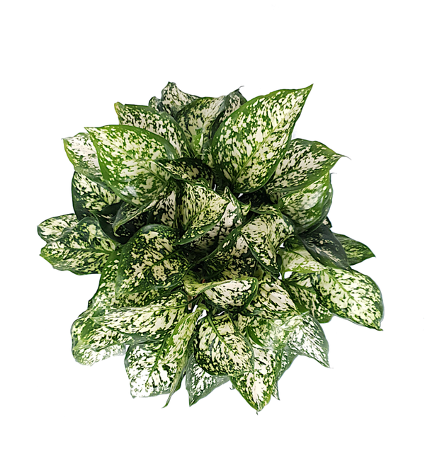 De Aglaonema snow white heeft groene bladeren met nagenoeg witte vlekken, vandaar ook zijn naam.