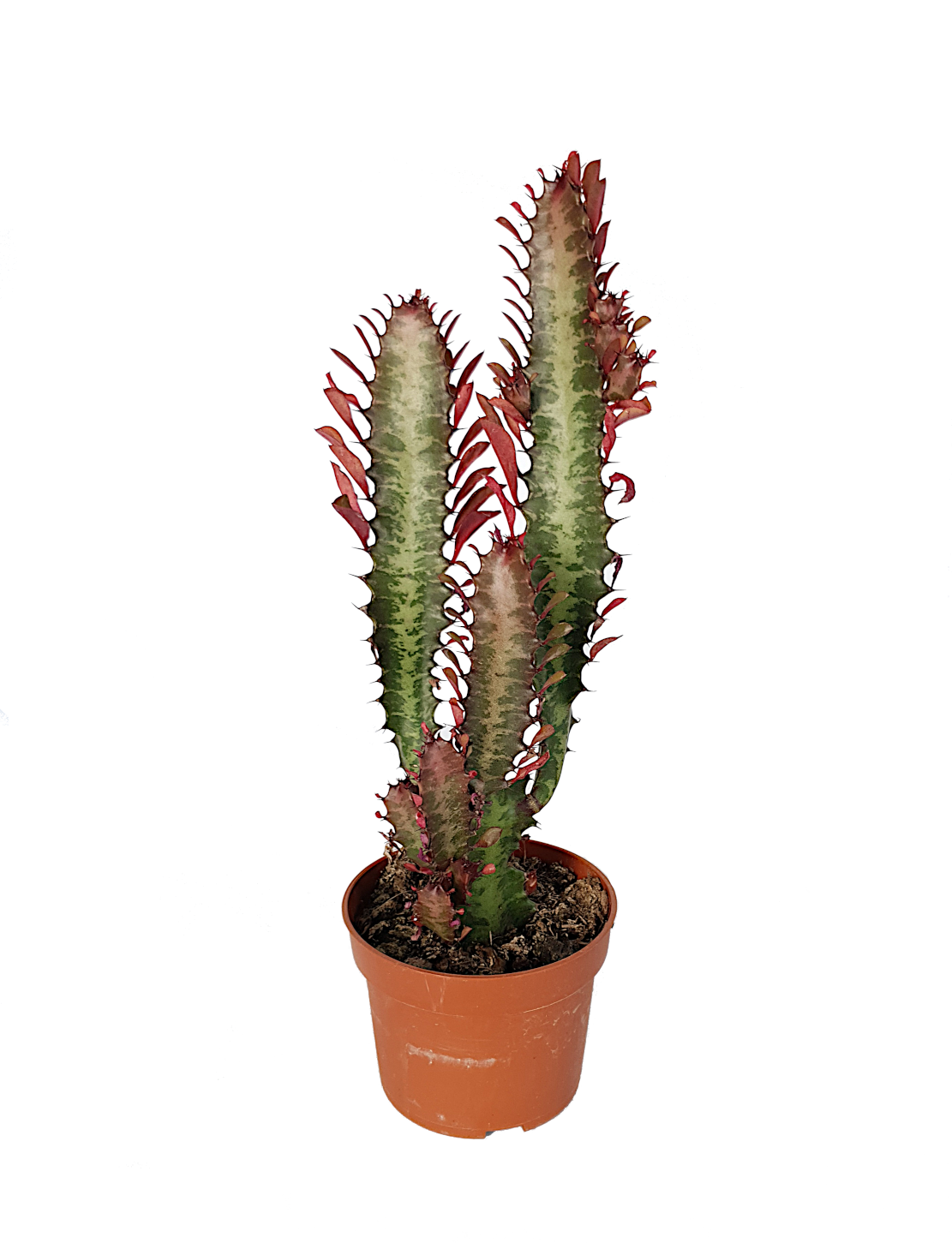 De Euphorbia Trigona 'Rubra' is het zusje van de Euphorbia Trigona. waar de Trigona groen is, is de Trigona 'Rubra' groen met rood/paars van kleur.