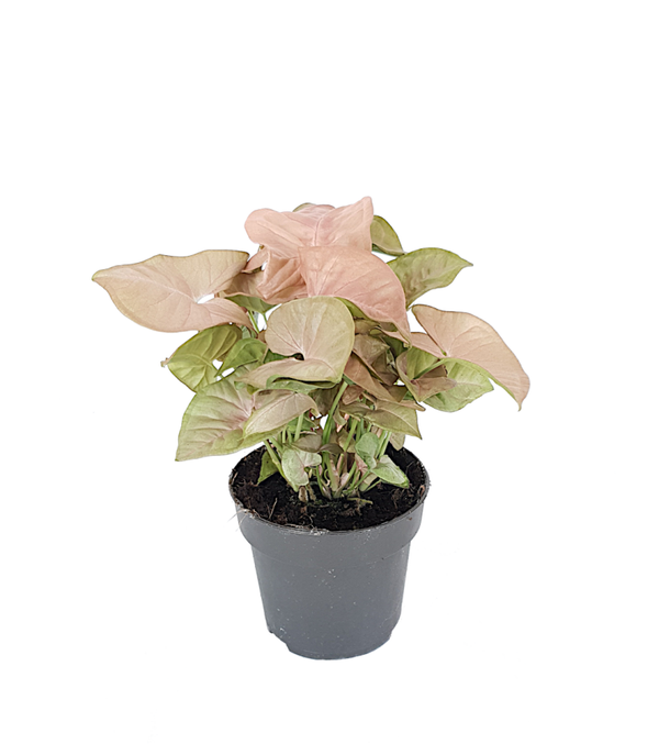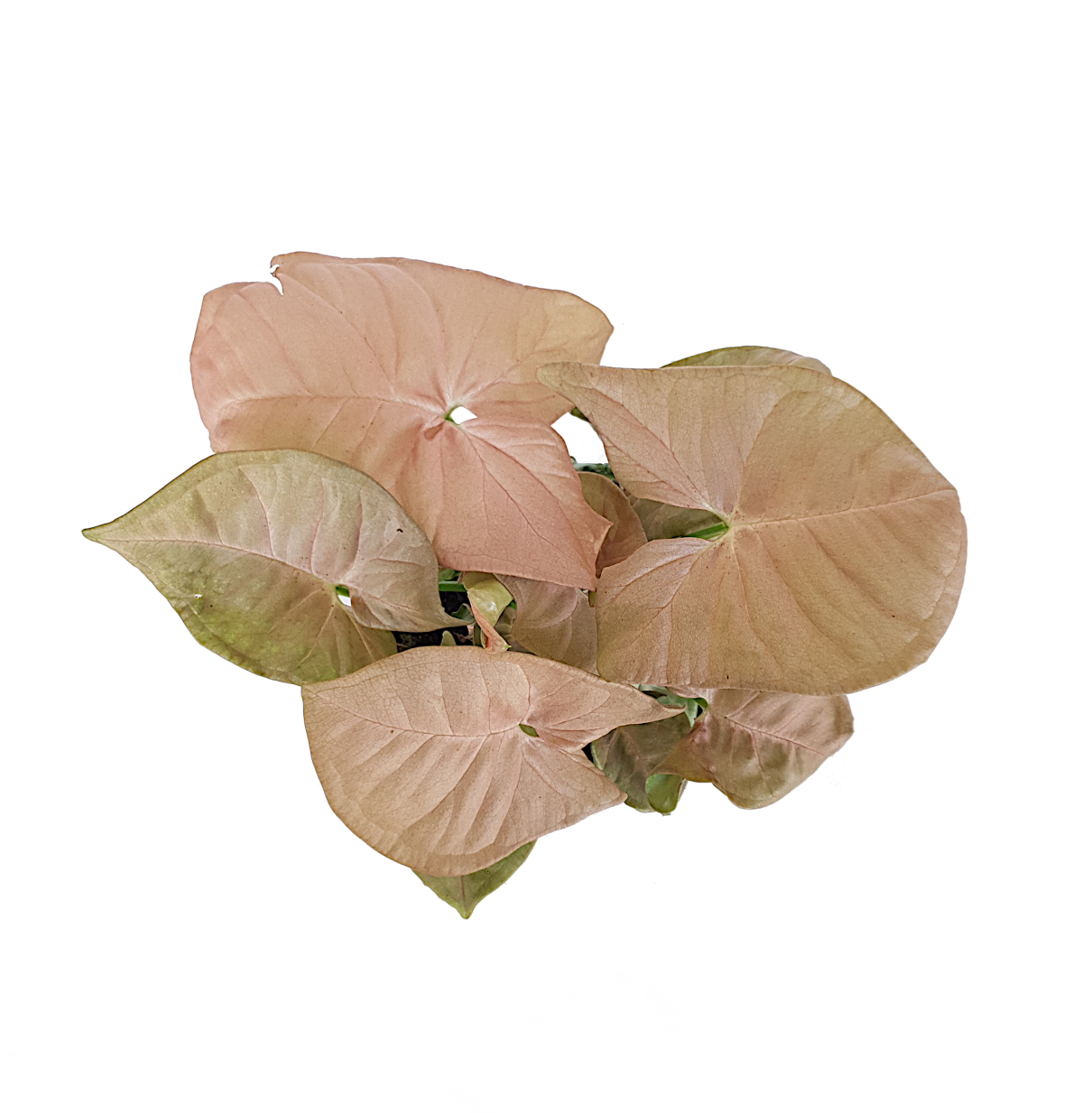 De Syngonium Neon Robusta, ook wel aronskelk genoemd, heeft pijlvormige bladeren in een zacht roze kleur.