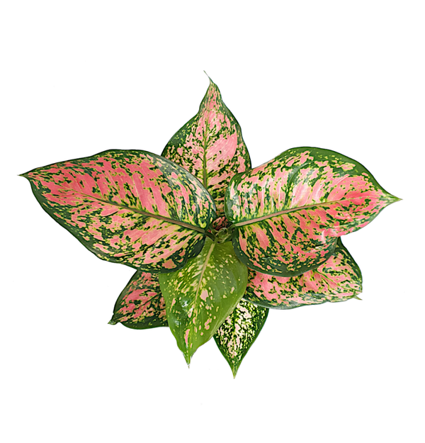 Deze Aglaonema heeft donkergroene bladeren met roze vlekken.