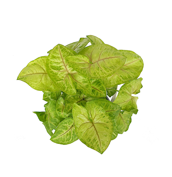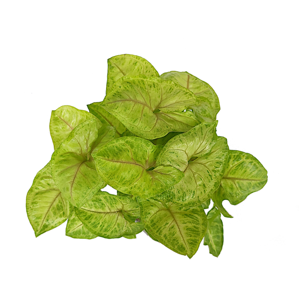Fris groene kamerplant met pijlvomige bladeren en roze nerf.